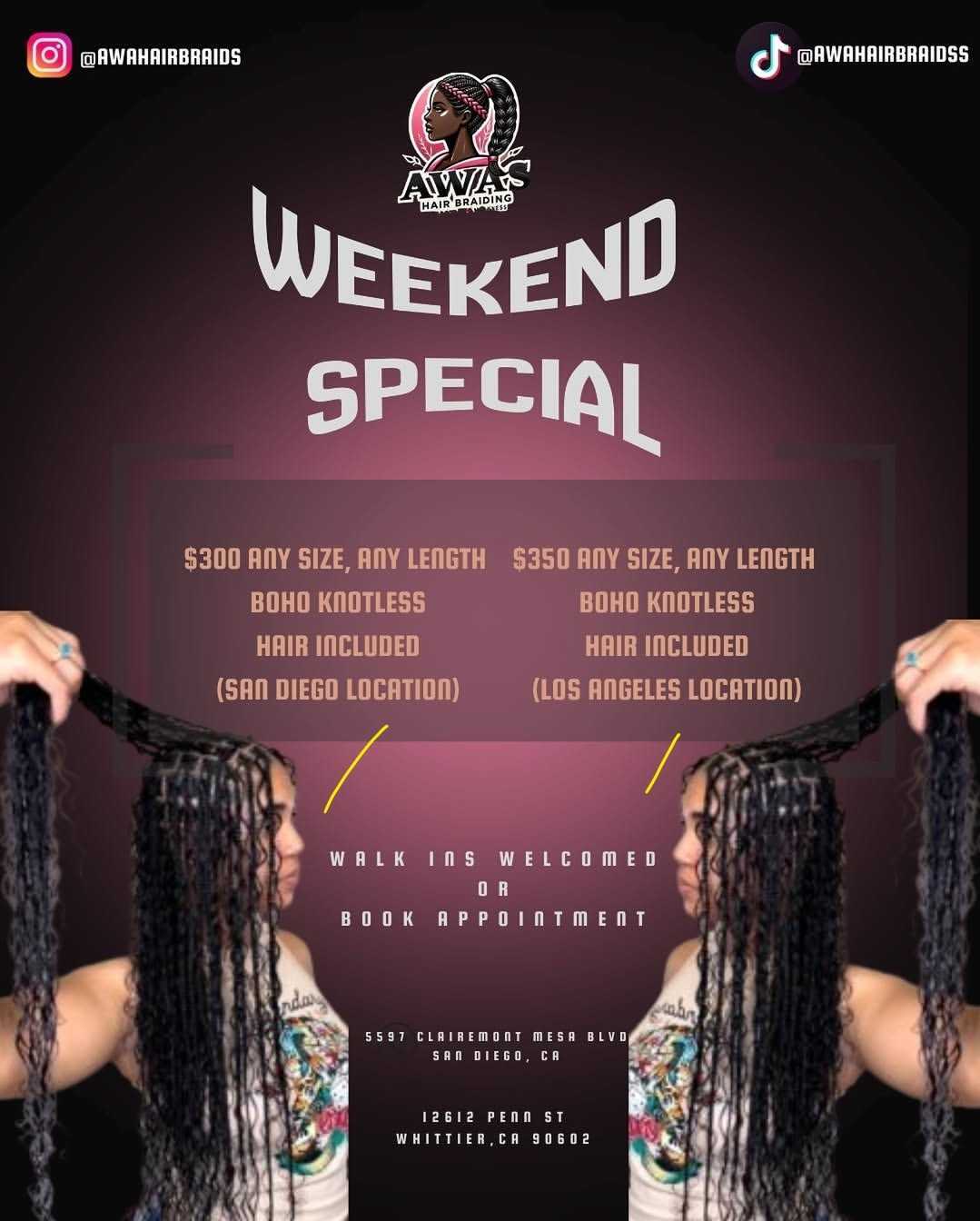 The weekend special is here . Any size , Any length $300 BOHO knotless with HAIR INCLUDED for a LIMITED TIME ONLY ! Lets get your appointment TODAY & join the BOHO BADDIES 💋💗